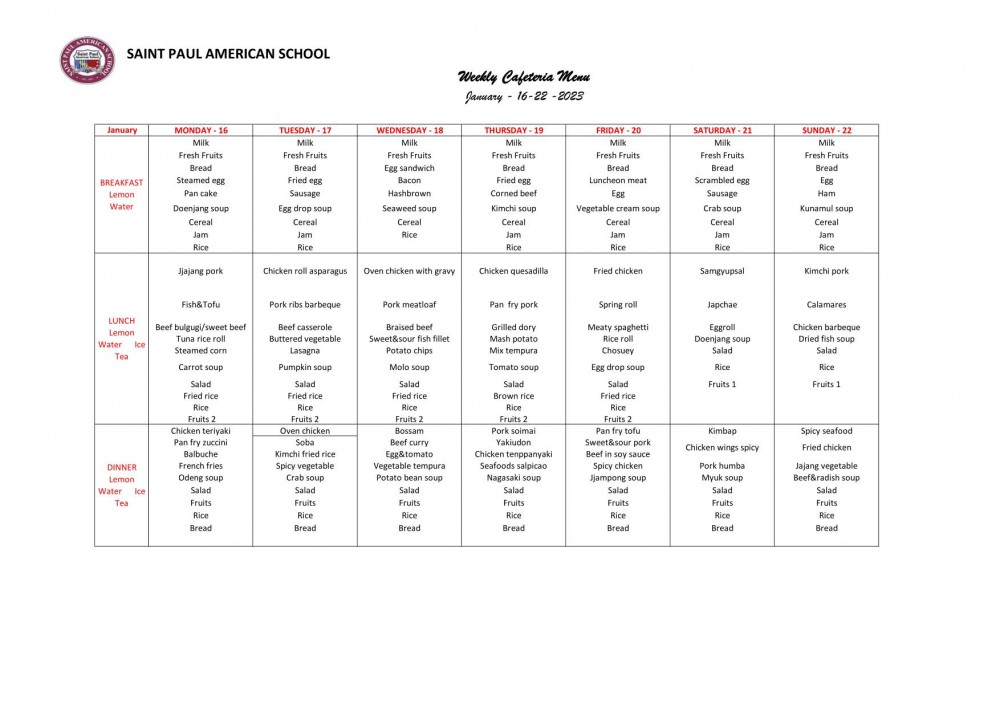 January 16 - 22, 2023 Cafeteria Menu