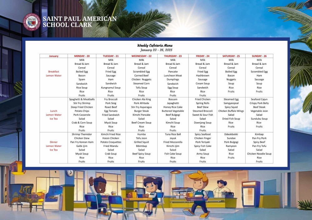 Weekly Cafeteria Menu January 20 - 26, 2025