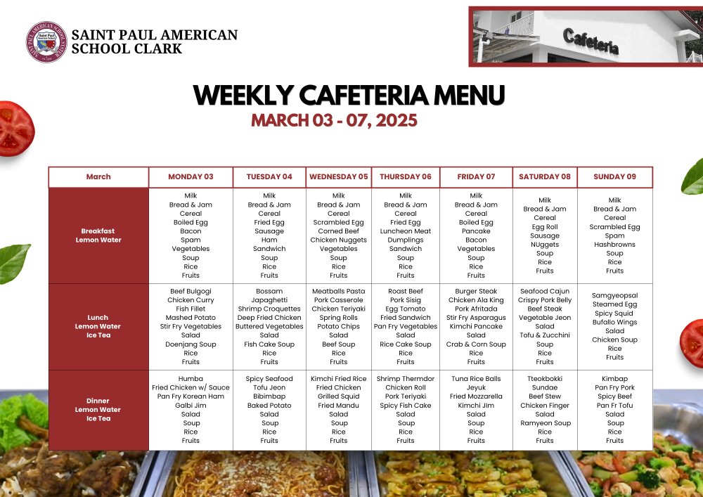 Weekly Cafeteria Menu March 3 - March 7, 2025