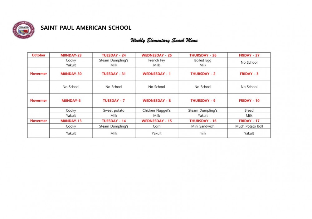 [Elementary Snack Menu] November 6 - November 17 페이지 정보 By SPAS Date23-11-06 11:58 Hit26,265 Link Previous Next List 본문 Elementary Snack Menu 댓글목록 등록된 댓글이 없습니다. Previous Next List