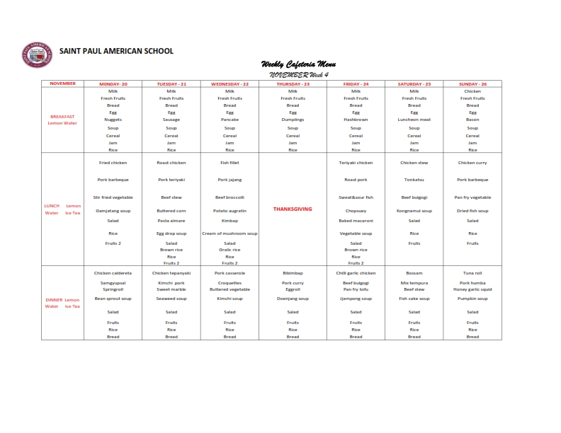 Weekly cafeteria menu Nov-week 4 페이지 정보 By SPAS Date23-11-13 16:38 Hit26,077 Link Previous Next List 본문 Weekly cafeteria menu Nov-week 4 댓글목록 등록된 댓글이 없습니다. Previous Next List